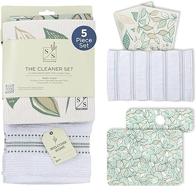 Stitch & Stone Cleaner Set - Perfect for Everday Kitchen Cleaning, 100% Cotton Kitchen Towel, Grip Mat for Dish Drying, Grip Mat for Sink Accessories, 2 Reusable Dishcloths - Leafy Green