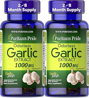 Puritans Pride Premium Odorless Garlic 1000mg Equivalent, Traditional Dietary Supplement for Heart Health and Circulation Support with Antioxidant Properties, 250 Rapid Release Softgels, 2 Pack